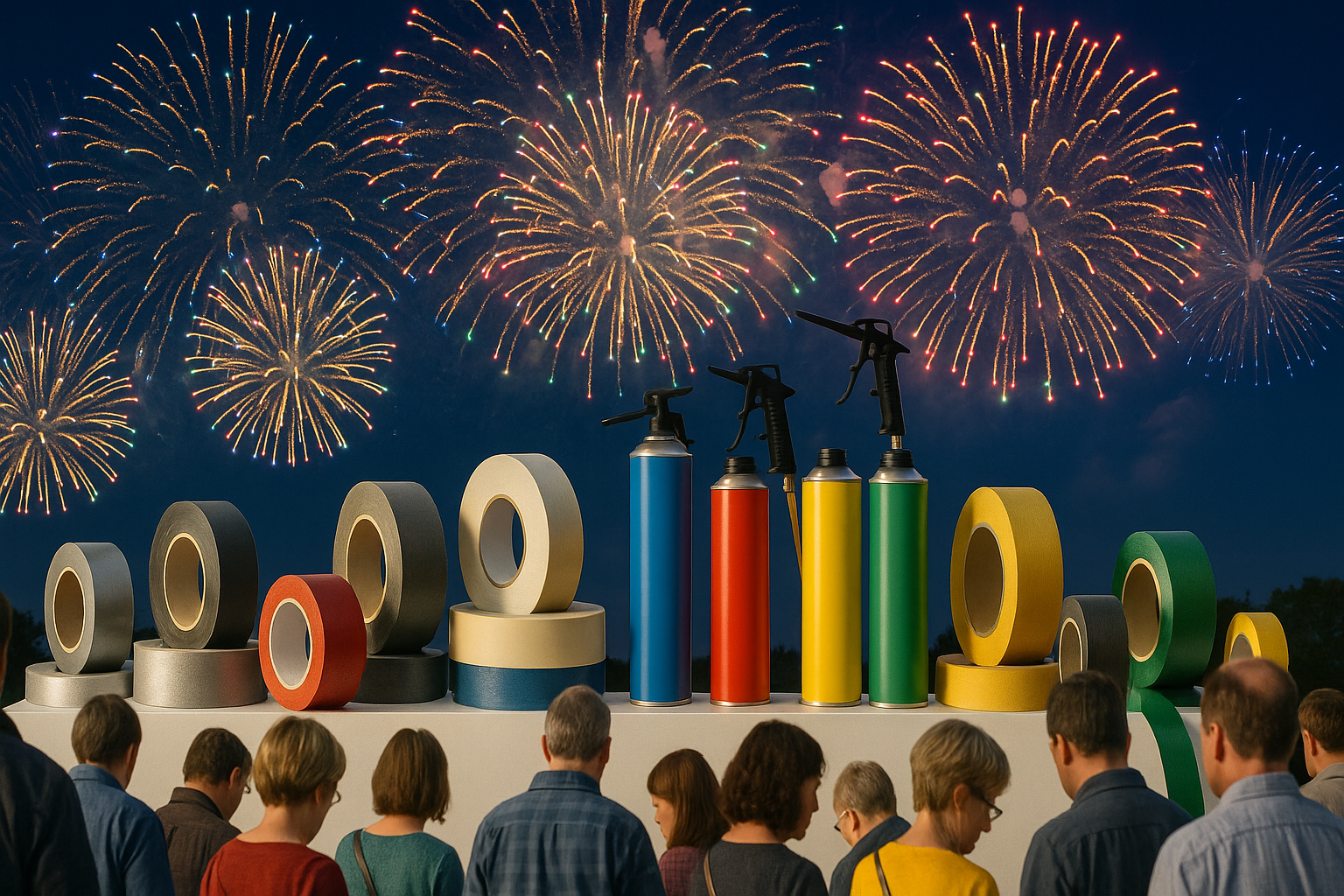 Wenn Maschinen aufleuchten, Werkzeuge glänzen, Klebebänder in allen Farben bereitliegen und Bauschäume in verschiedenen Größen präsentiert werden, dann ist es Zeit für eine besondere Veranstaltung. In Hamburg fand eine Produktpräsentation der Extraklasse statt mit Gabelstaplern, Baggern, Handwerkzeugen, Klebebändern und Pistolenschaum im Mittelpunkt. Und als Höhepunkt: ein spektakuläres Feuerwerk von Krause Feuerwerke, das den Himmel über der Stadt erstrahlen ließ.